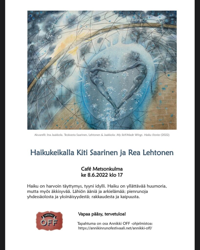 Rea ja Kiti tarjoilevat Café Metsonkulmassa lähiön ääniä ja arkielämää; pienrunoja yhdessäolosta ja yksinäisyydestä; rakkaudesta ja kaipuusta. Puolituntinen on ensikurkistus painotuoreeseen runokokoelmaan My Self-Made Wings. Haiku Stories – Haikutarinoita.