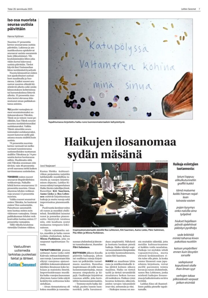 HAIKU STORIES: SYDÄN MÄSÄNÄ -esitys vei katsojat matkalle rakkauden eri sävyihin käsitellen niin särkyneitä sydämiä ja uusien alkujen toivoa. Kiti, Rea ja Aamo toteuttivat runollisen rakkauden musiikkimatkan ja sitä seuranneen moniaistisen runopajan Laitilan Kinossa perjantaina 24.1.2025.